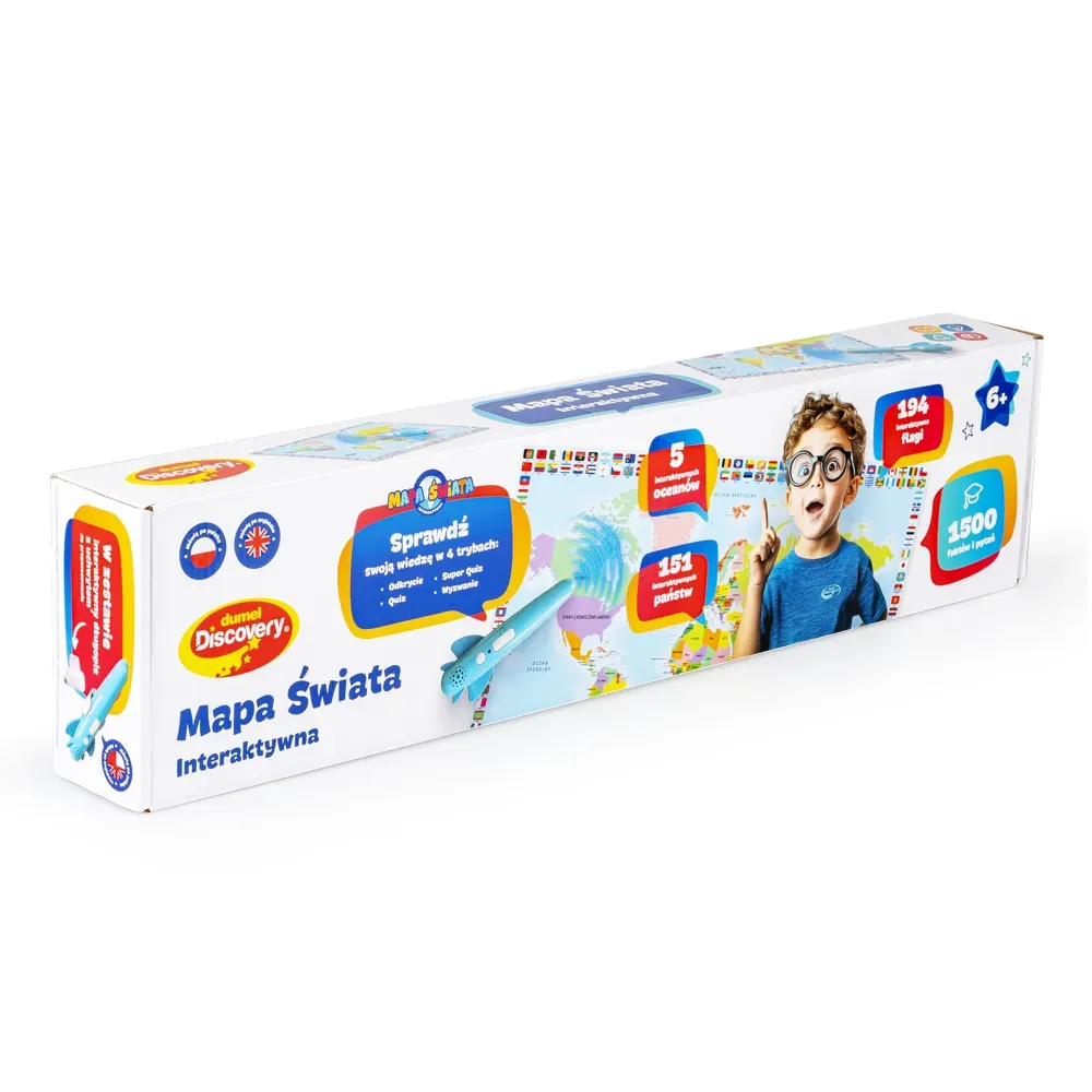 Zapraszamy na podróż dookoła świata… długopisem po mapie! Ten odlotowy, edukacyjny zestaw kryje w sobie kolorową mapę oraz interaktywny długopis w kształcie samolotu, który aktywuje dźwięki, pozwalając małym podróżnikom na odkrywanie oceanów, państw i ich flag. Na mapie znajdują się aktywne pola, które w połączeniu z interaktywnym długopisem z zestawu opowiadają o państwach, przekazując różne informacje oraz ciekawostki na ich temat. Zabawka jest dwujęzyczna (polsko-angielska), dzięki czemu po przyswojeniu wiedzy w języku polskim, dziecko może ćwiczyć znajomość języka obcego, próbując swych sił w wersji anglojęzycznej. Do wyboru są cztery tryby zabawy. Pierwszy (Odkrycie) to tryb nauki, w którym słuchamy nazw i informacji, trzy kolejne (Quiz, Super Quiz oraz Wyzwanie), to tryby rozrywki, w których można sprawdzić swoją wiedzę, odpowiadając na pytania. Quiz oraz Super quiz umożliwiają grę solo, a tryb Wyzwanie – emocjonującą rozgrywkę w duecie.